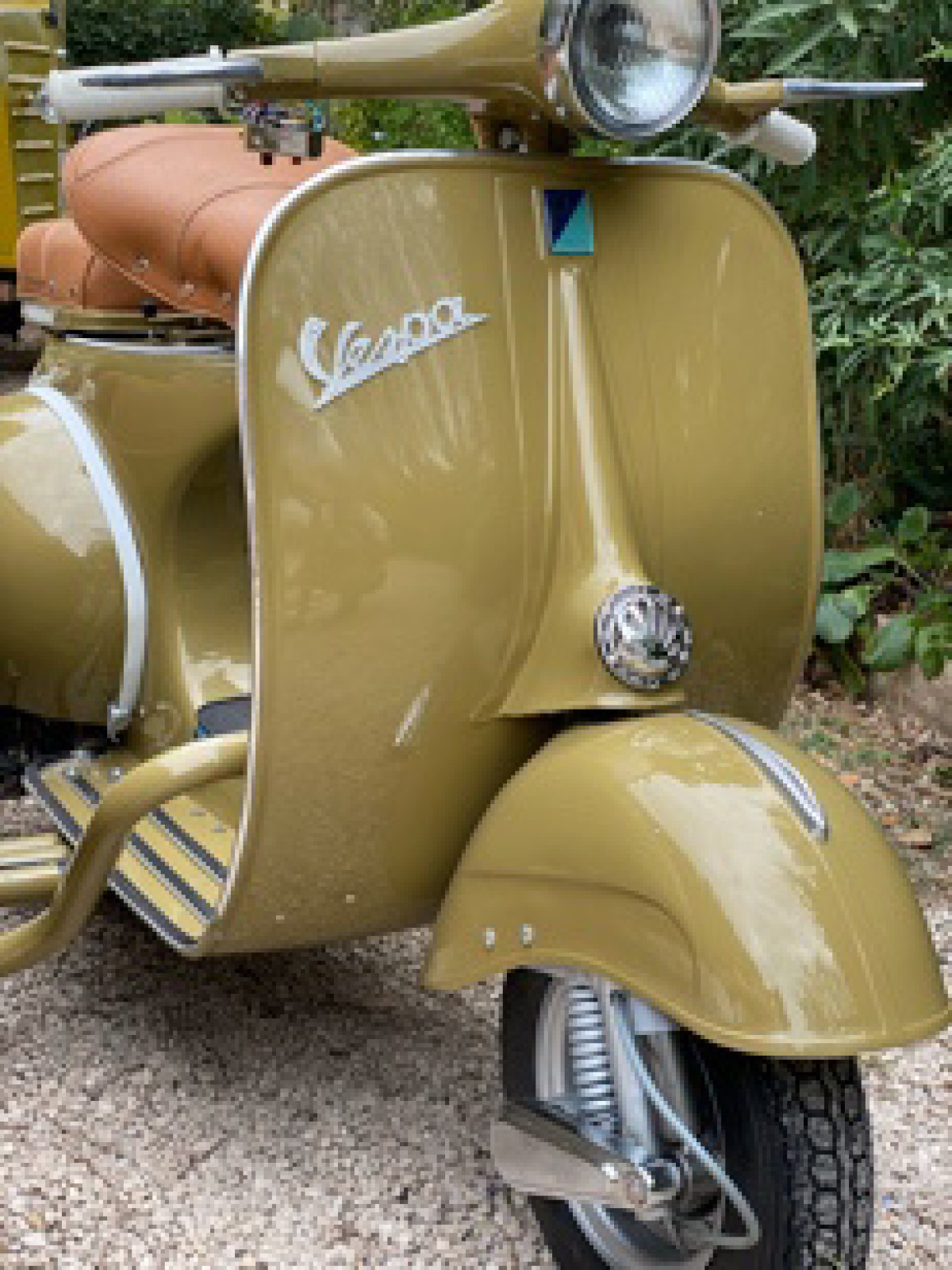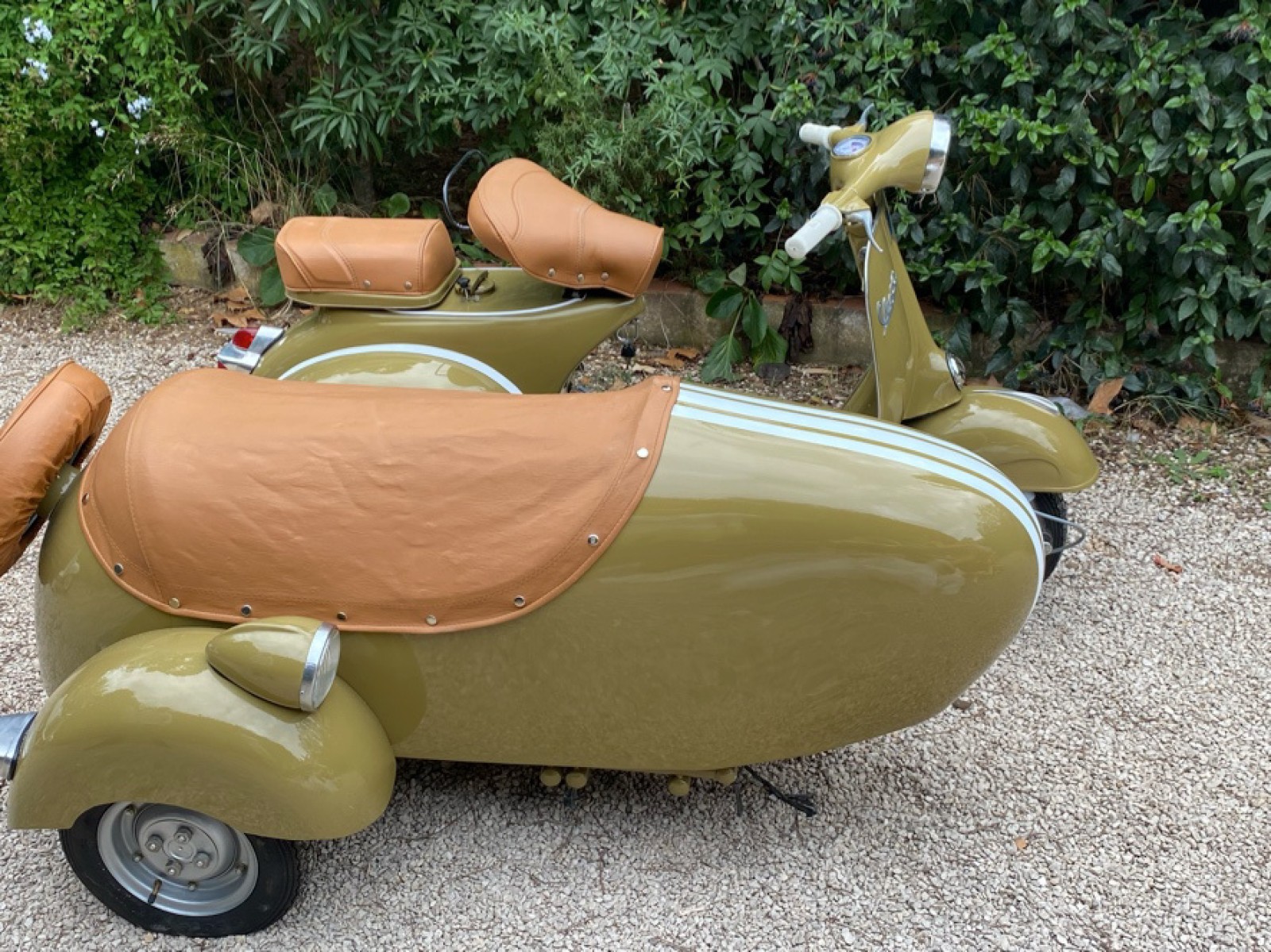 Restauré intégralement, ce Vespa VNB affiche un état esthétique et mécanique irréprochable. Sa carrosserie a été remise à neuf, avec une teinte olive élégante parfaitement assortie à une sellerie cuir couleur miel, recréant fidèlement l’esprit Vespa des années 60. Le sidecar, parfaitement intégré et aligné, bénéficie du même niveau de finition premium : peinture complète, couvre-tonneau sur mesure, optiques rénovées et jantes restaurées.